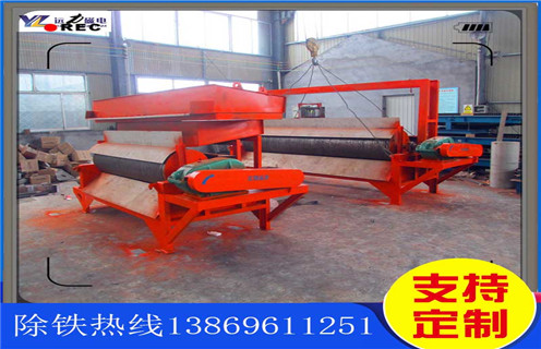 4、含有鐵磁性雜質(zhì)的物料通過受料斗經(jīng)電磁振動給料機均勻的下到第一道輸送皮帶上,當(dāng)物料通過強磁輥時,鐵磁性物質(zhì)被磁力吸引被吸附到強磁輥上,隨著皮帶的轉(zhuǎn)動使其從磁場脫離并落入收集斗中。其它物料和沒有選凈的鐵磁性物質(zhì)隨溜槽進(jìn)入下一級磁選皮帶進(jìn)行分選,原理同上。最后選出合格的產(chǎn)品。